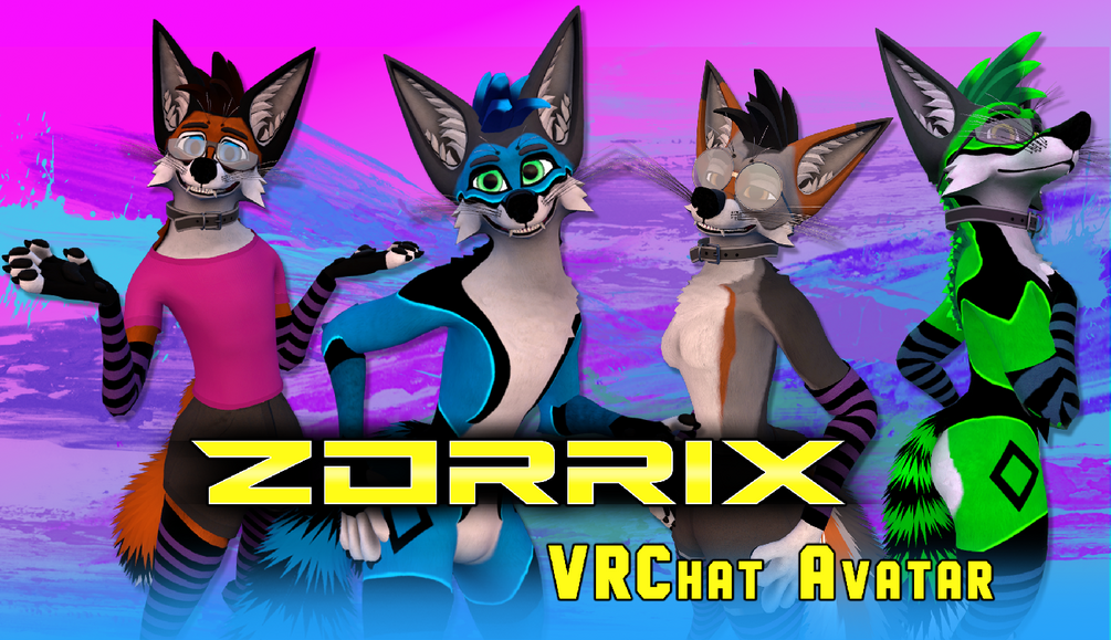 The Zorrix is an anthropomorphic vulpine/canine avatar designed for use with VRChat. It was built to match human proportions and sync tightly to full-body tracking (FBT). This avatar is highly detailed and exceptionally configurable, with over 100 blend-shapes out of the box.